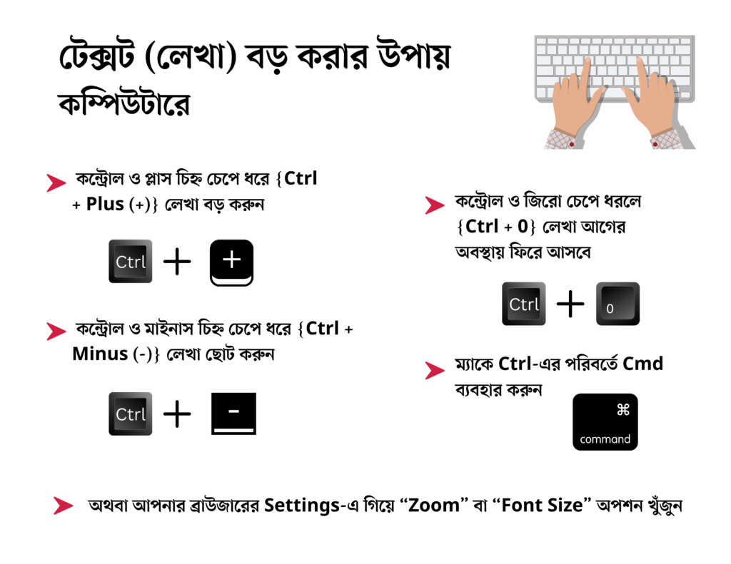 - কন্ট্রোল ও প্লাস চিহ্ন চেপে ধরে {Ctrl + Plus (+)} লেখা বড় করুন