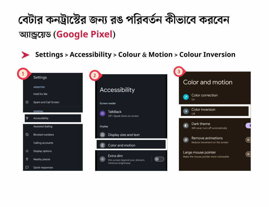- Google Pixel: Settings > Accessibility > Colour & Motion > Colour Inversion