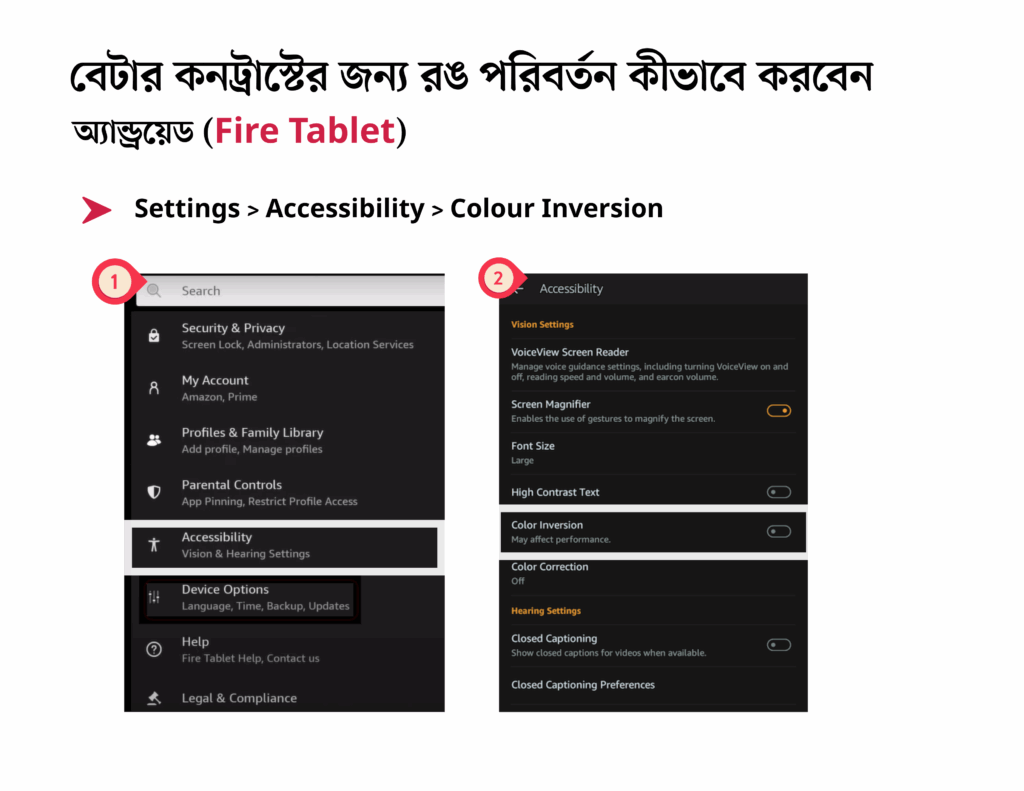 - Fire Tablet: Settings > Accessibility > Colour Inversion