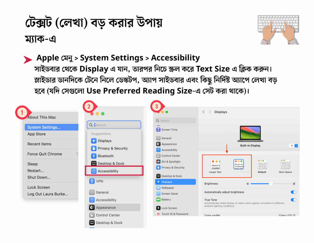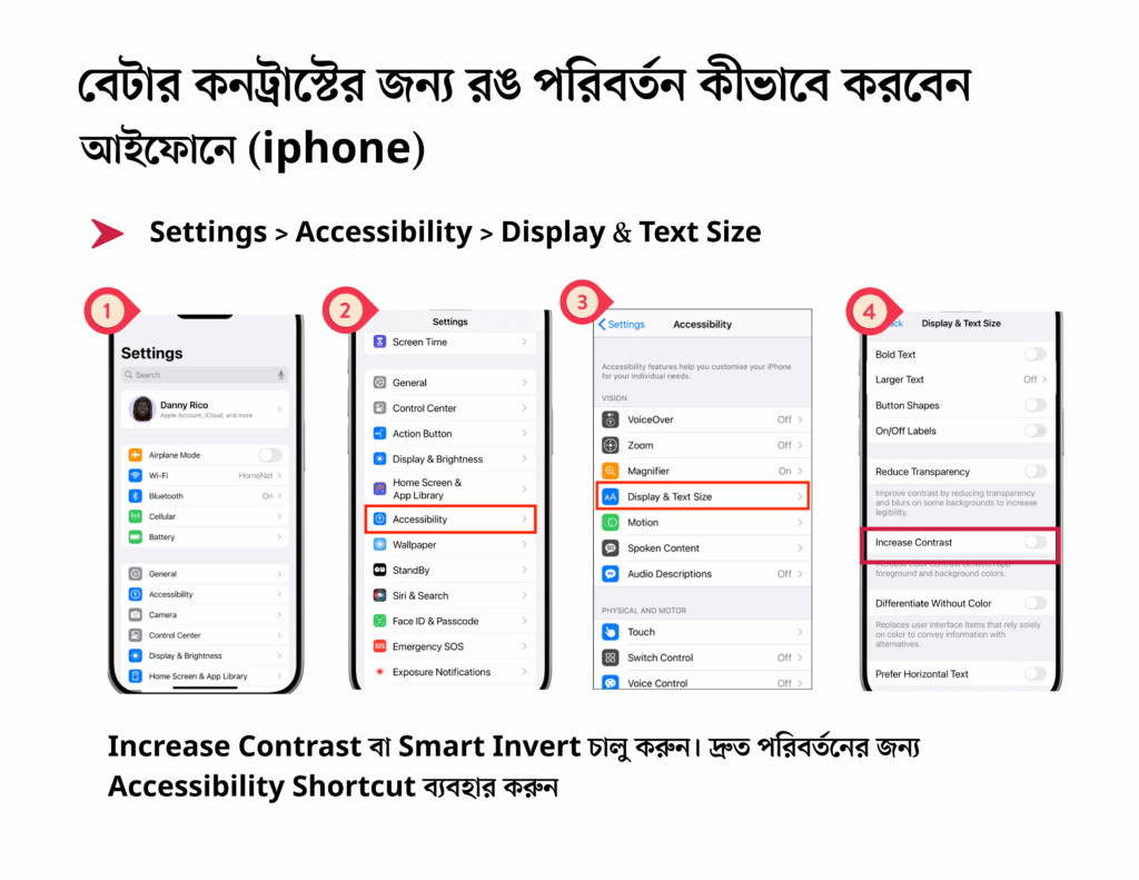 সাধারণত যেসব পরিবর্তন বেশি দেখা যায় তার মধ্যে রয়েছে—রঙের কনট্রাস্ট বাড়ানো, অথবা টেক্সট সাইজ বড় করা। নিচে আমরা কিছু দিকনির্দেশনা দিয়েছি কীভাবে আপনি এ ধরনের পরিবর্তন করতে পারেন।