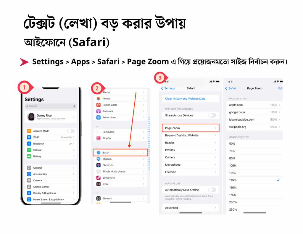 Settings > Apps > Safari > Page Zoom এ গিয়ে প্রয়োজনমতো সাইজ নির্বাচন করুন।