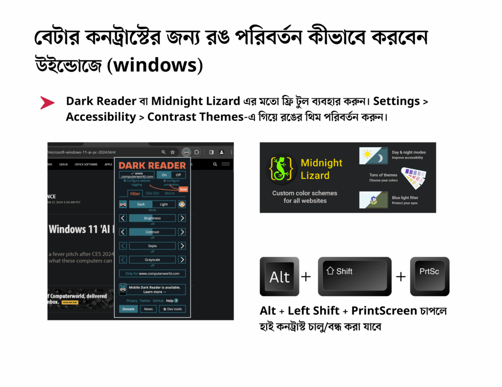 - Alt + Left Shift + PrintScreen চাপলে হাই কনট্রাস্ট চালু/বন্ধ করা যাবে।