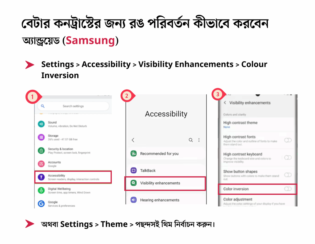 - Settings > Accessibility > Contrast Themes-এ গিয়ে রঙের থিম পরিবর্তন করুন।